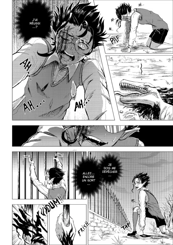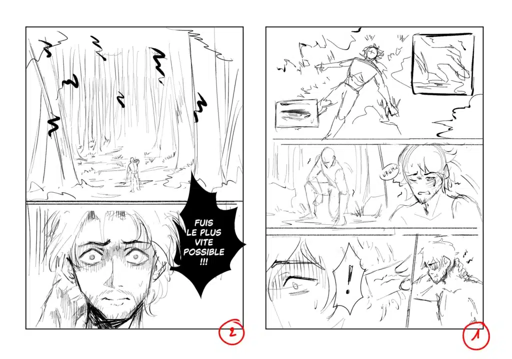 Ces pages ont été réalisées dans un temps particulièrement limité, puisque je n’avais que deux mois, et étais en alternance à ce moment là. Je n’avais donc que le matin, très tôt, et le soir, pour dessiner, me laissant environ 2h par jour. Ainsi, certaines pages ont été réalisées très très rapidement.